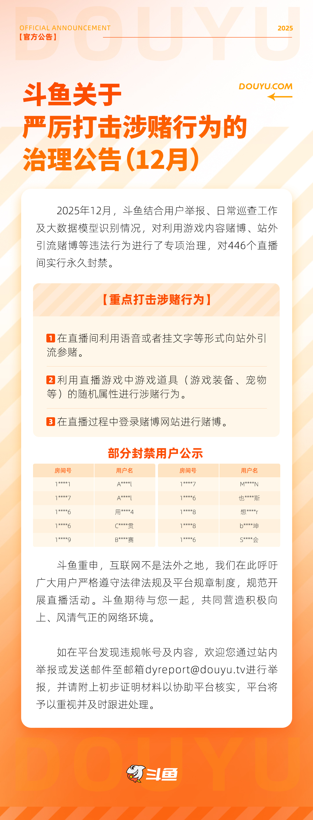 斗鱼关于严厉打击涉赌行为的治理公告(2025年12月)