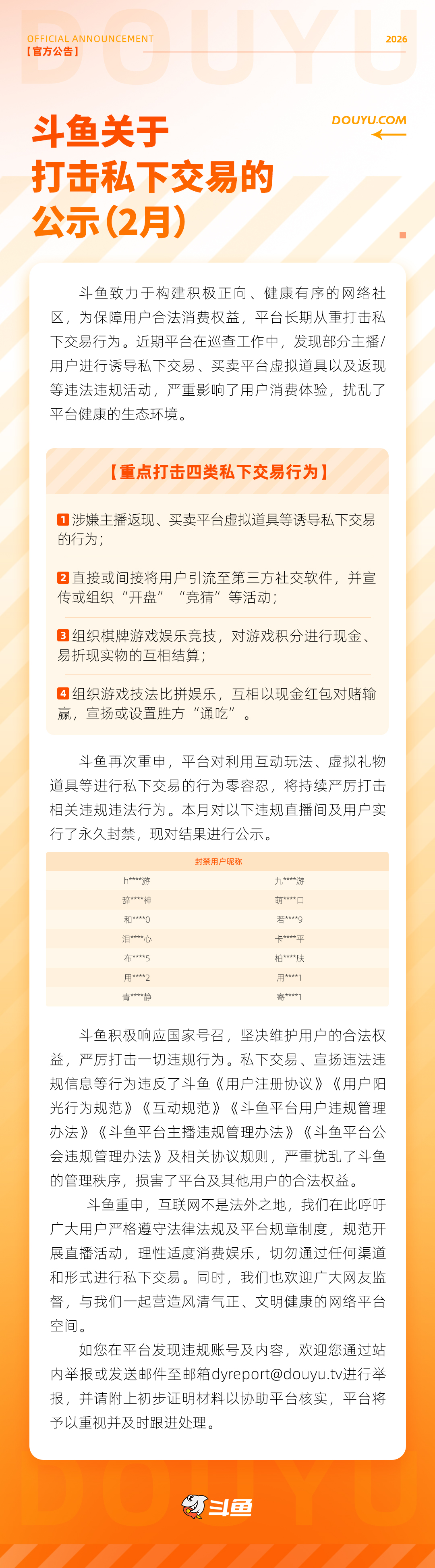 斗鱼关于打击私下交易的公告(2月)