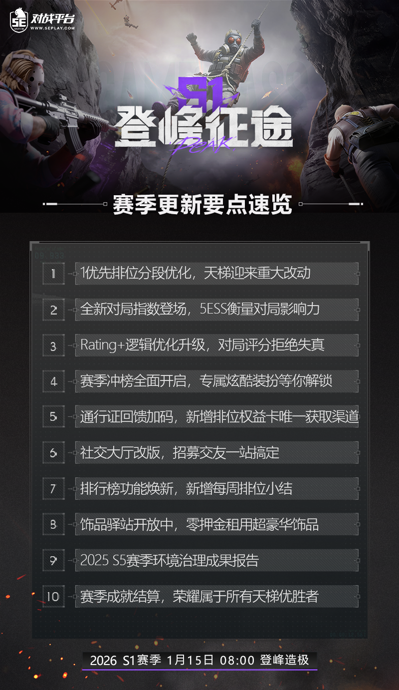 有关2026 S1排位段位更新、5E Swing Score 和 Rating+优化的内容,将在后续发布的【5E对战平台2026S1赛季排位前瞻】进行详细介绍,请玩家们关注后续公告。