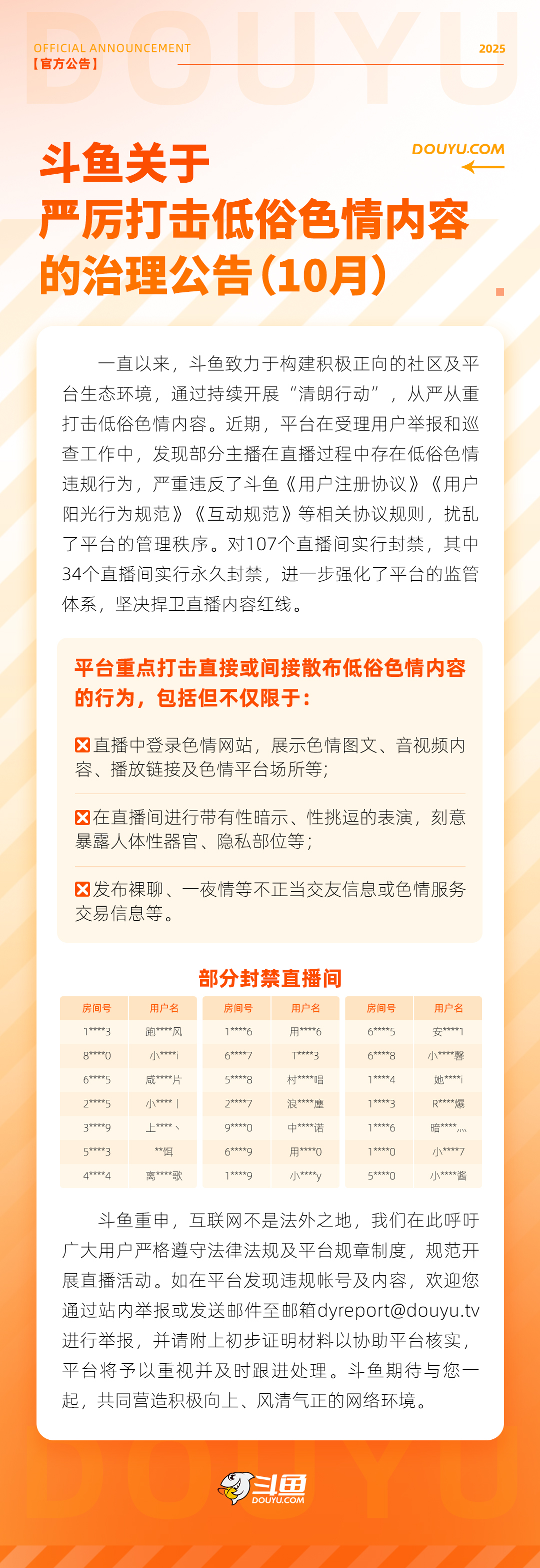 斗鱼关于严厉打击低俗色情内容的治理公告(10月)